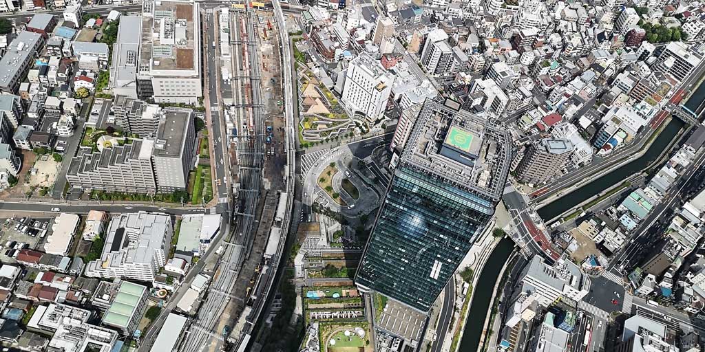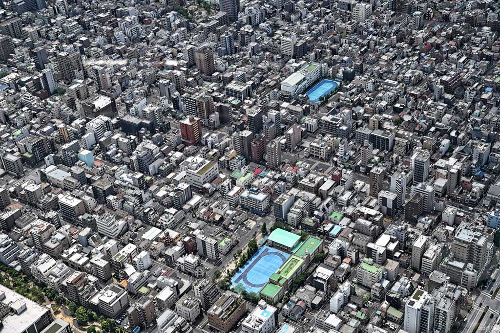 Blick aus dem Tokyo Skytree auf Sportplätze und Gebäude © 2023 Eric FischerBlick aus dem Tokyo Skytree auf Sportplätze und Gebäude